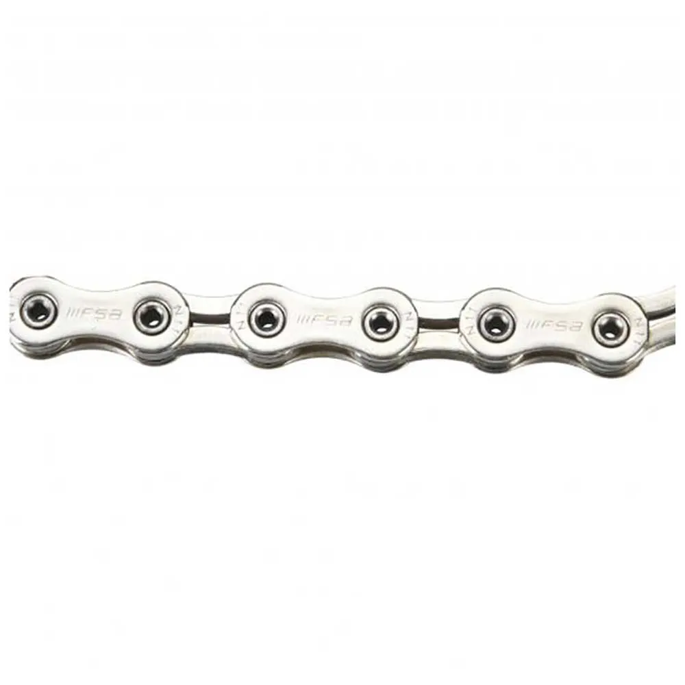 The K-Force WE chain is FSA’s premium offering for 11 speed systems. Whether you’re on the road or hitting the trail, you’ll certainly appreciate all the technology this chain offers. Hollow pins reduce weight, optimized outer plate shapes reduces shift noise, and plate chamfers decrease sprocket wear while increasing shifting precision. If you’re looking for a chain with unrivaled durability and performance, choose the K-Force WE.