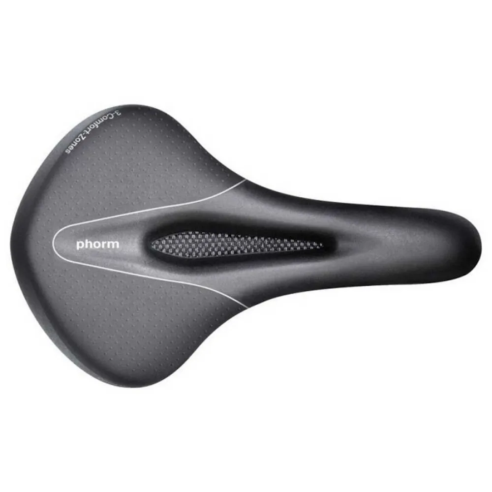 The phorm fitness series has been developed using our 3 zone comfort principle. designed for fitness and leisure riders, on both mountain bikes and road bikes, who have a moderately sporty sitting position. this means with the weight further forward, and a more dynamic riding style. it is the stepping stone between touring and sports saddles. the wider rear section allows for increased weight distribution, but an overall narrower design for more freedom of movement.High quality, soft to the touch and durable all-weather durasilk synthetic cover. comfort gel inserts for greater pressure distribution.sit bone width 110-150 mm / 4´ 33´´ – 5´ 91´´rails: annodized fec light Steel.cover: weathermax duralux, wind and splash guard under relief cannel.